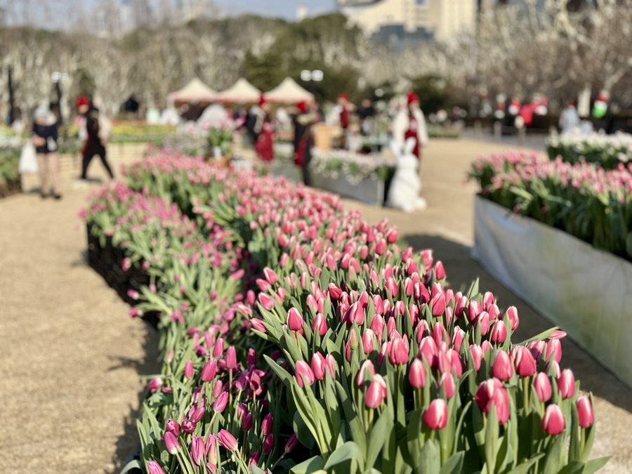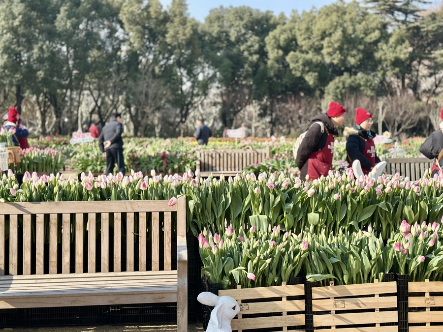 此次花市的一大亮点,是今年最早的“郁金香花田”和郁金香采摘体验区。新民晚报记者看到,复兴公园大草坪上,郁金香主题“光明花园”成为一片绝美花海,超过600㎡的水培郁金香呈色块分布,蜿蜒小路既实现游客分流,又营造出层次丰富的视觉效果。大型仿真郁金香装置与真花融为一体,粉、白、紫等色彩交织,随手一拍都是浪漫。