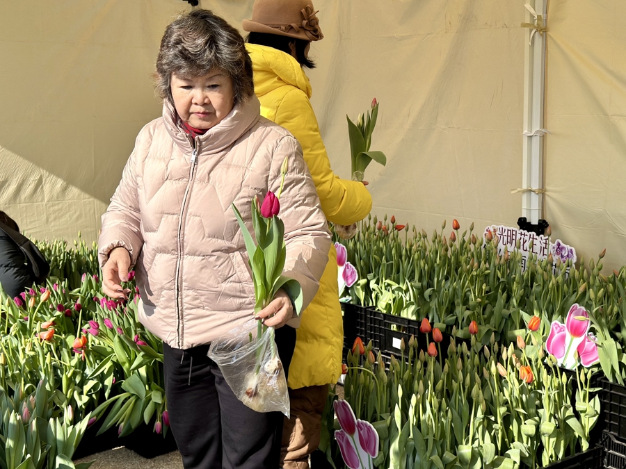 在一旁的采摘区,市民花29.9元就能亲手采摘10枝新鲜郁金香,将带着晨露与清香的郁金香现场包装成花束带回家。市民陈先生和夏女士正在采摘区挑选着不同花色的郁金香。“现在花鸟市场市区里已经很少了,都在很远的地方,去一次不太方便。我们从手机上看到介绍,今天特地从浦东过来,还可以现场采摘,办得很好。”陈先生告诉新民晚报记者。“在采摘区有20多个品种的郁金香,这些花都带着种球,带回家后瓶插期会更长。”杨娟说。