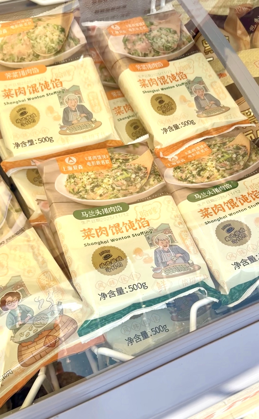 比如,爱森带来了黑猪猪油、黑猪香肠等产品,香肠还分原味和广式风味的。不仅如此,《菜肉馄饨》电影的联名款菜肉馄饨也可以在这里买到,口味还有好几种,包括黑猪荠菜鲜肉、马兰头猪肉、荠菜猪肉等。上海水产则带来了远洋自捕的红虾、摩洛哥的墨鱼刺身等,回家解冻就能吃,储存方便,49元一盒的价格也比市面上便宜不少。