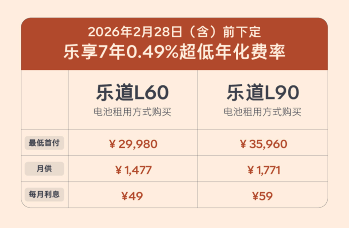 蔚来及旗下乐道品牌的方案力度更为突出,蔚来针对新ET5、ET5T、ES6等车型,乐道针对L60、L90车型,均推出年化费率0.49%的7年超低息方案,首付20%起(乐道L60首付2.998万元起、L90首付3.596万元起),且无金融服务费、提前还款无违约金,乐道还叠加购置税最高减免3805元、最长5年免费NOA领航等权益,综合优惠价值至高4.9万元,其合作银行提供的方案可实现车辆所有权直接登记在个人名下,非“以租代购”模式。此外,吉利、岚图、东风奕派等车企也同步推出相关方案,年化费率集中在1.5%-4.88%之间,部分采用融资租赁模式,首付比例最低可至0%-15%,进一步拉低购车门槛。