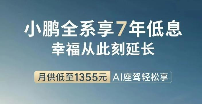 理想汽车则针对全系车型推出方案,L6、L7、L8、L9及i6等车型首付15%起(低至3.25万元),年化费率2.5%,月供2578元起;理想MEGA与i8享有专属权益,前3年免息、后4年年化费率2.5%,MEGA首付15.98万元起、i8首付9.98万元起,月供均低至2857元起,该方案为融资租赁产品,车辆所有权需还清贷款后过户。小鹏汽车于1月22日跟进,旗下MONAM03、P7+、G6等全系车型均可享受7年低息,首付最低15%,年化费率1.67%(折算年化利率3.18%),月供低至1355元,覆盖入门级至中高端多款车型,贴合其年轻化用户定位。